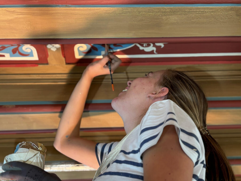 Formée à l’École Pivaut (2017-2020), reconnue pour son enseignement académique du dessin, puis à l’École Sablé, spécialisée en peinture décorative dans la tradition de Van Der Kelen, Victoire consacre aujourd’hui une part importante de son activité au service des églises et chapelles, qu’il s’agisse de fresques murales ou d’ornements liturgiques.